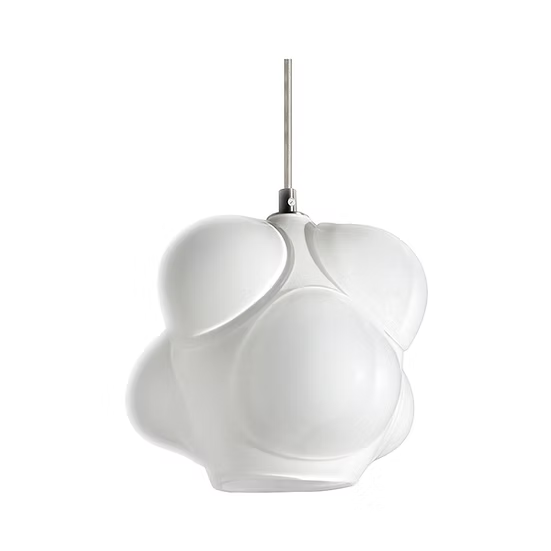 La lámpara de techo Cumulo está Inspirada en la pasión por las curvas y las formas voluptuosas, las piezas cúmulo se elaboran con pepitas de vidrio fundido unidas a un núcleo central. Las piezas calientes se soplan para difuminar el color y crear una forma bulbosa similar a una nube.