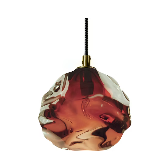 La serie Lámpara de techo Happy juega con las cualidades reflectantes y maleables del vidrio. Esta línea consta de piezas pesadas de paredes gruesas, manipuladas a mano para crear una forma arrugada y única.