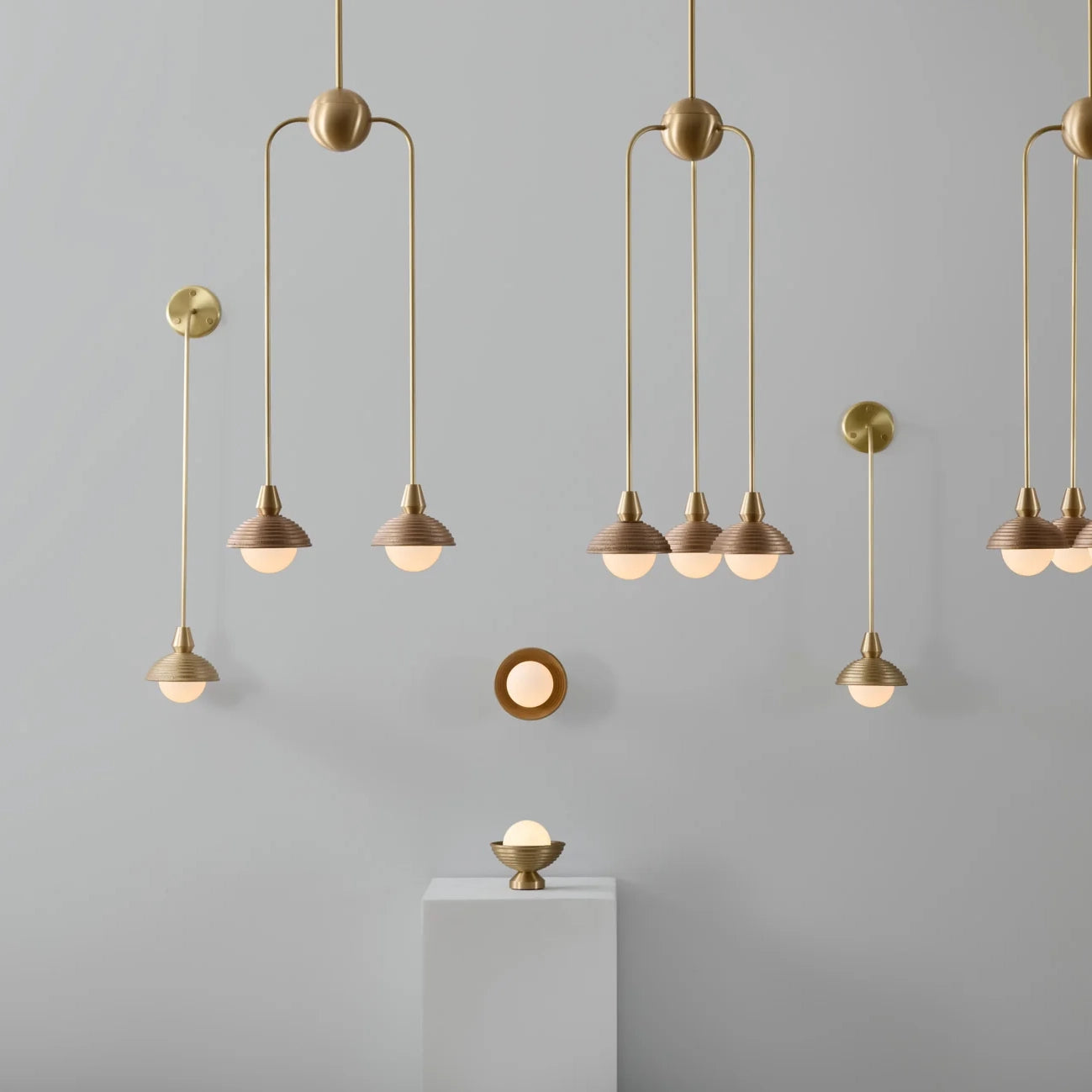 Una reinterpretación moderna de la lámpara de mesa con forma de copa, esta lámpara luce una pantalla acanalada de fundición en arena combinada con latón, y un globo de vidrio esmerilado que difunde la luz, creando un brillo cálido y suave.