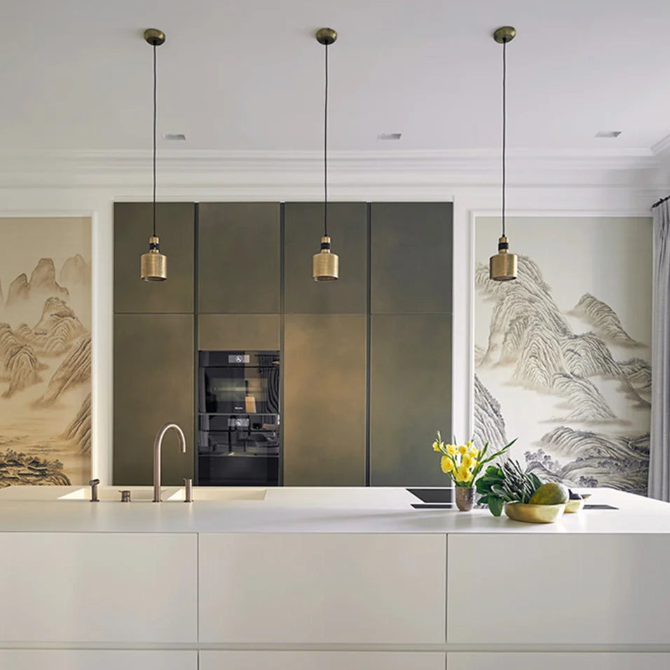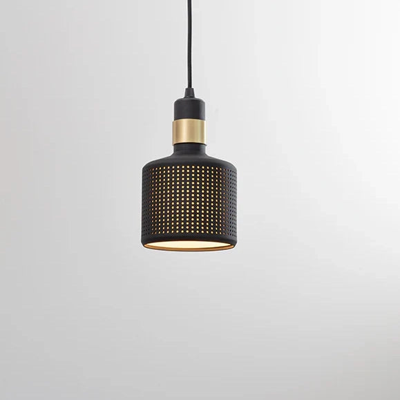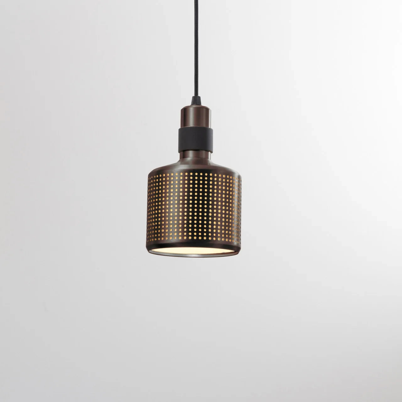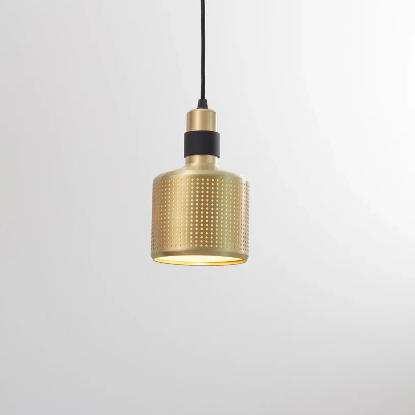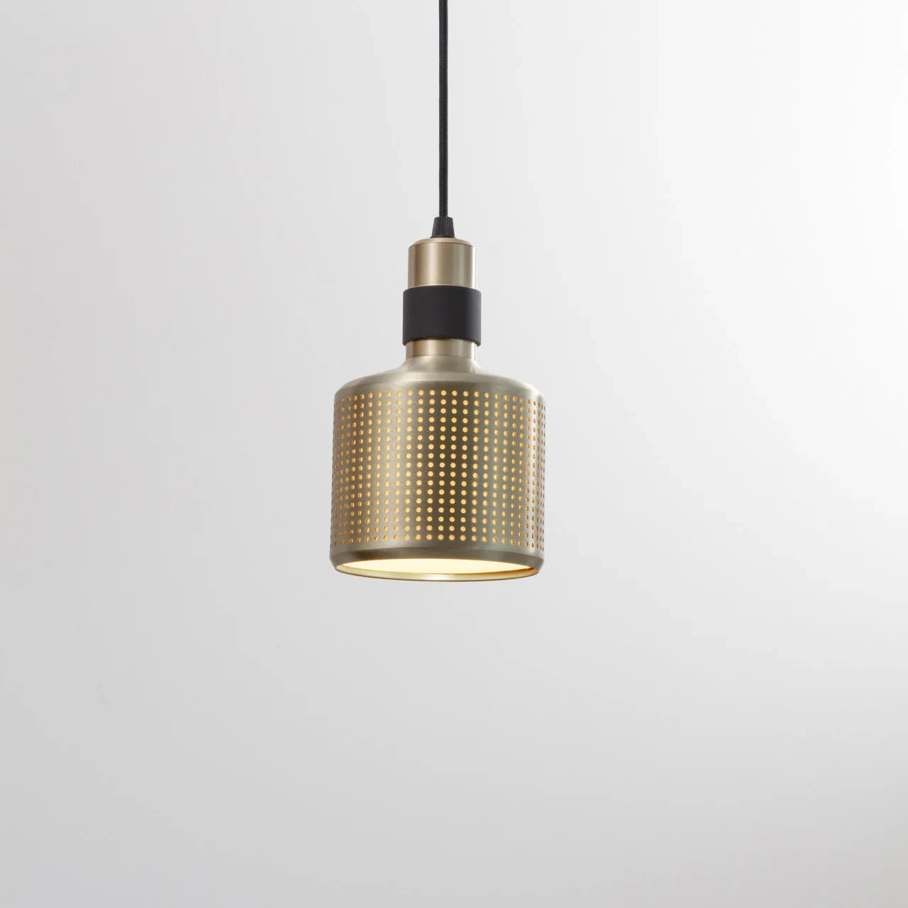 Lámpara de techo Riddle, nuestro diseño inaugural. Pantalla de latón mecanizado perforado con inserto de tela que proyecta una luz suave y cálida. Su versatilidad permite colocarla sobre una mesita de noche, una isla de cocina o una barra de desayuno.